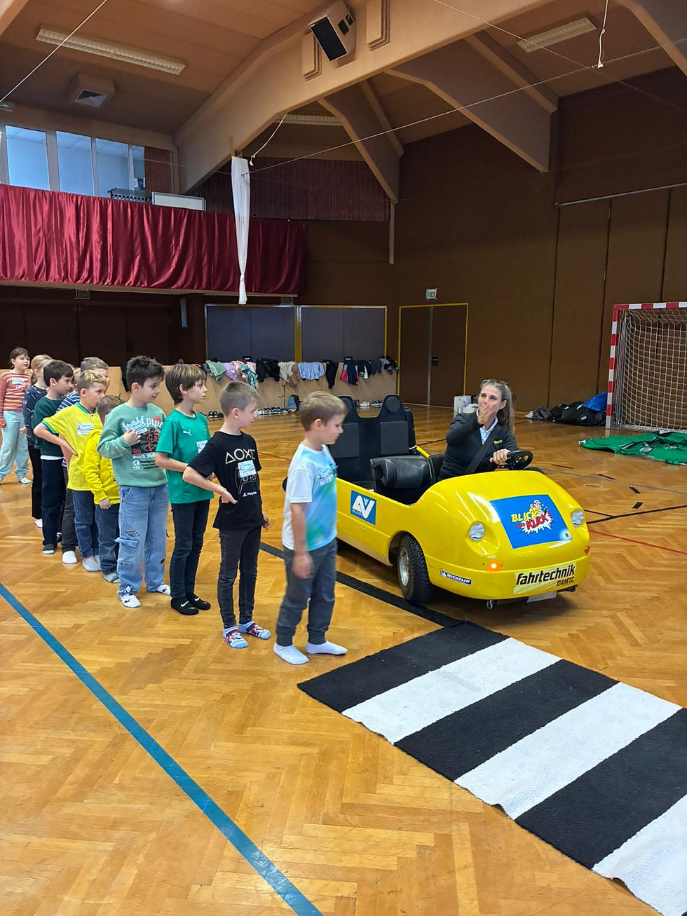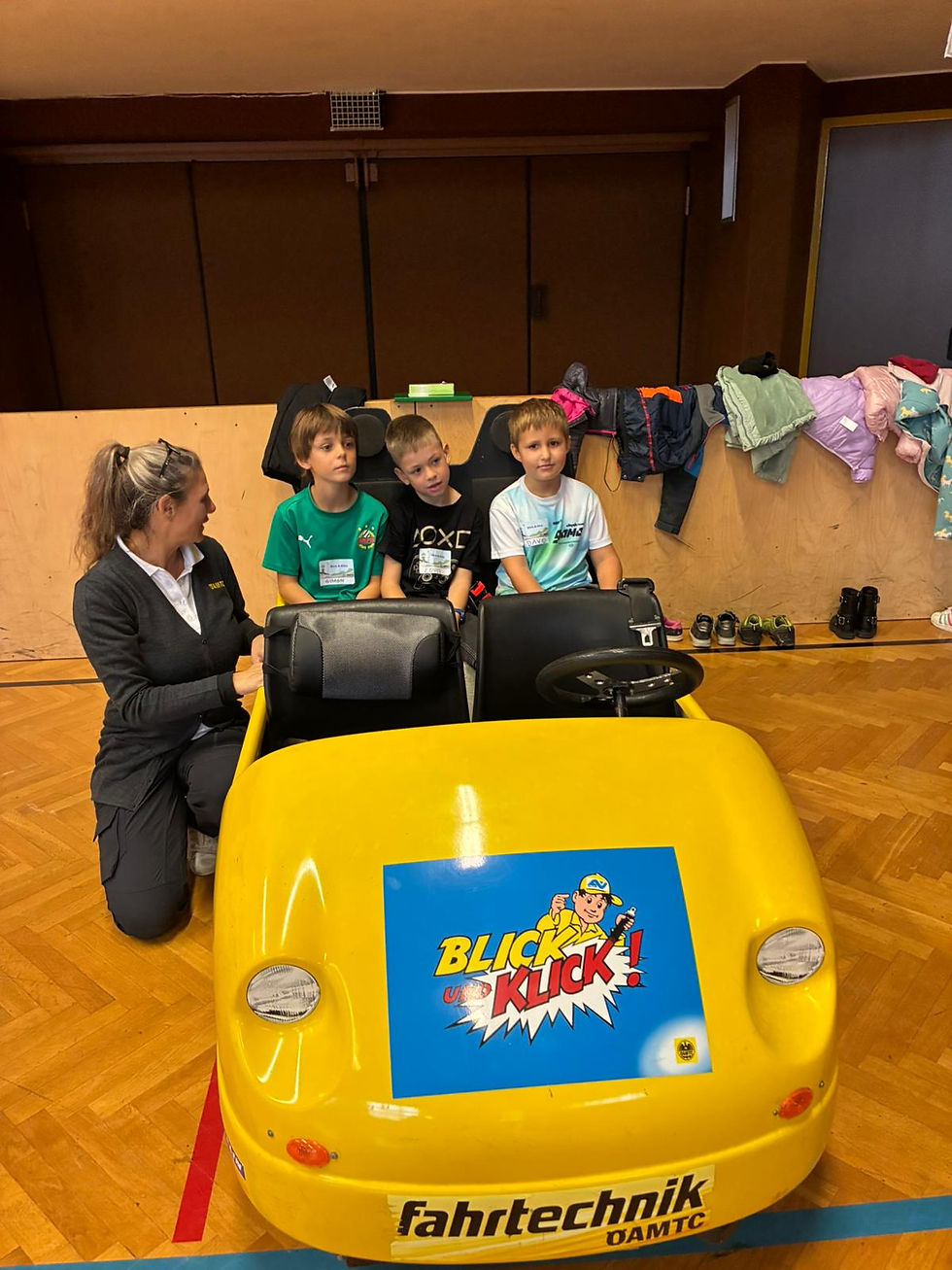 Die 2.Klassen nehmen an einem Verkehrserziehungsprojekt von ÖAMTC und AUVA in der Losensteinhalle teil. Die Kinder üben sicher über die Straße zu gehen und wie wichtig Kindersitz und Gurte sind.
